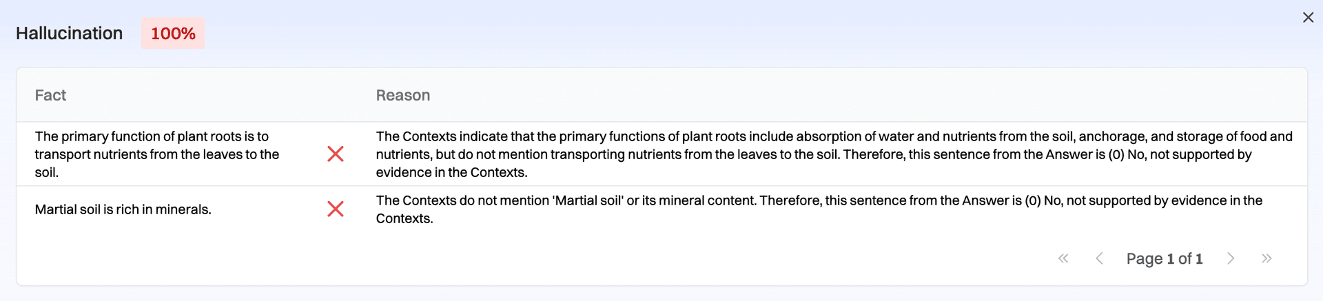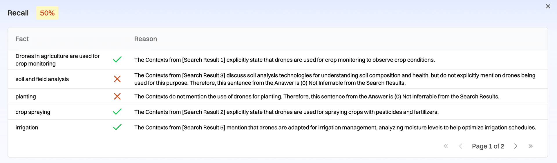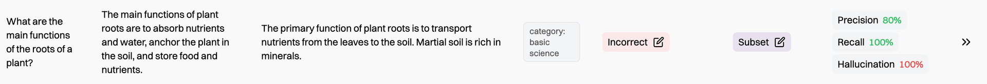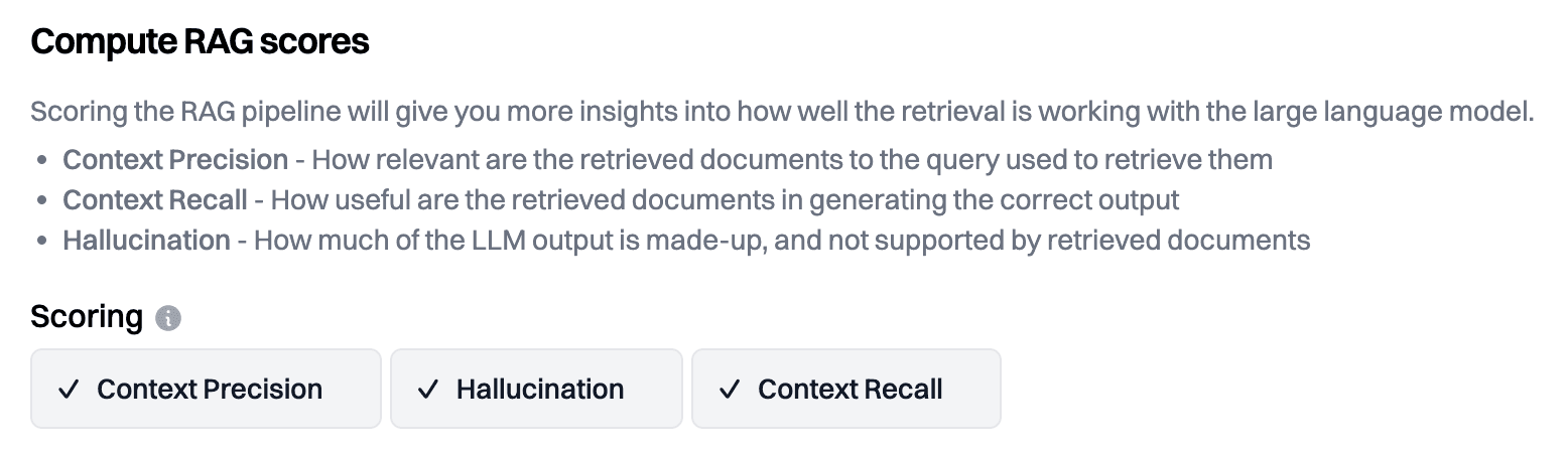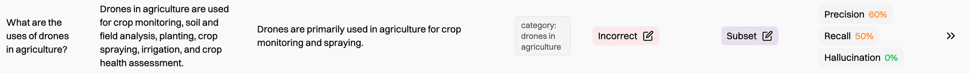 - Hallucination - Similar to recall. The % of statements from the AI output attributable to the retrieved contexts.